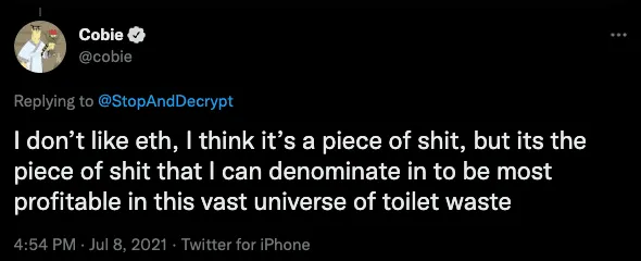 But is that second approach sufficient? Does the network care about number go up? Or are the ETH maxis just sitting around jerking to the burn?