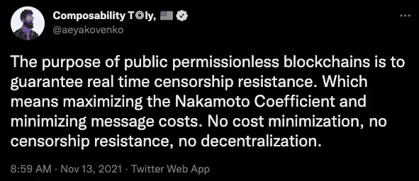 Anatoly often argues that Solana is optimized for “stopping the first strike in a nuclear war” (by maximizing the Nakamoto coefficient and real time censorship resistance to prevent a majority attack), and Ethereum is optimized for “picking up the pieces” after. However, an insurmountable staked value is just as important as the Nakamoto coefficient to prevent the strike.