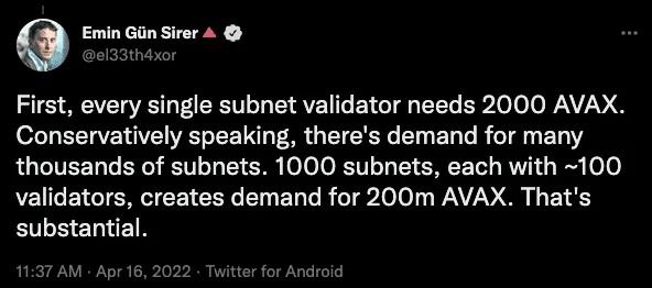 It also assumes that every subnet validator is a completely new AVAX validator (i.e., causing 2000 AVAX new market buy pressure). In reality many will likely be existing Avalanche Primary Network stakers locked up today. Similar block producing entities across the ecosystem would be expected. As a result, no 2000 AVAX new buy pressure.