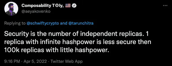 This is particularly concerning because Solana is ill-equipped to deal with this attack. Anyone can fully validate Solana, but that requires meaningful capital and effort that the 99% of users will never be able to do. Networks such as Ethereum or Celestia with a religious adherence to allowing everyday users to rest behind near full node security (with low capital and hardware requirements) are far more capable of dealing with and recovering from a 51% attack. Cryptographic assurances are always preferred to cryptoeconomic ones. If all your light clients know not to accept the invalid chain being attacked, you greatly mitigate the damage that can be done.