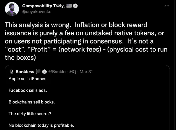 Despite not directly penalizing PoS value capture for high inflation here, I do still believe that a relatively low inflation rate is valuable for monetary stability and premium. If one of these L1s hopes to move from “speculative investment” into real “money” someday (denominate your wealth in it, medium of exchange, etc.), a high inflation rate seems untenable. Even if it doesn’t directly harm a valuation, it causes price instability and makes it difficult for users to have the asset on hand (unstaked) for spending.