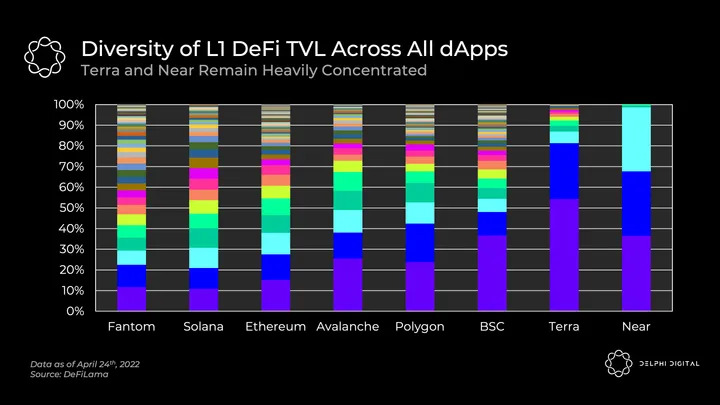 Economic diversity also adds to the stability of economic strength. Reliance on just a handful of applications brings meaningful risks. This is most notably the case for Terra and Near, though Near is still very early on in growing out its TVL: