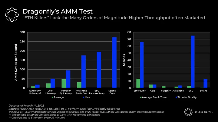 Dragonfly ran a great test recently comparing max AMM swap throughput across chains as a uniform benchmark, and the results were even more tightly packed: