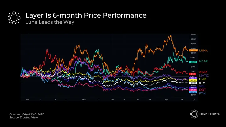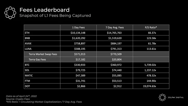 LUNA is generating nearly all of its current revenue from native stablecoin market swaps. This provides an interesting takeaway for other L1s – implementing a native stablecoin mechanism internally could provide meaningful organic revenue. Note this contrasts with Near’s recently launched USN, which is managed by an independent DAO Decentral Bank.