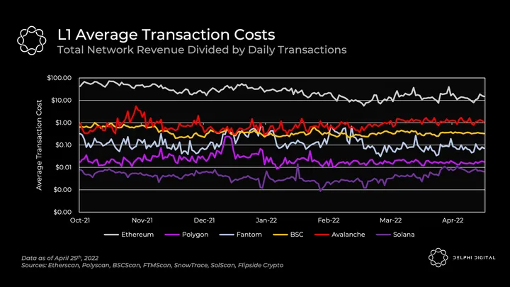The graph below displays the dilemma chains face. Ethereum is expensive to use, Solana is cheap, and the rest fall somewhere in between. Alternate chains have gained traction primarily because they can offer much cheaper fees than Ethereum. However, they eventually need to scale throughput to capture more value without jacking up individual transaction fees (easier said than done) or they risk losing their customer base.