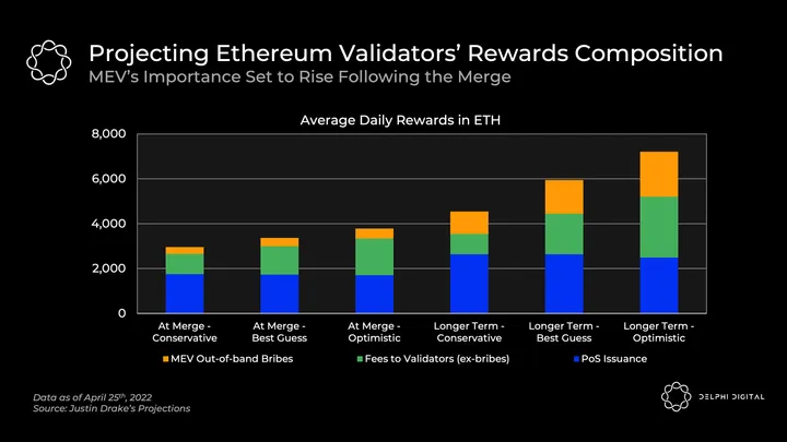 Following the merge, MEV is set to take a more important role in Ethereum than ever before as an increasingly large share of validator rewards. The below projections come from Justin Drake: