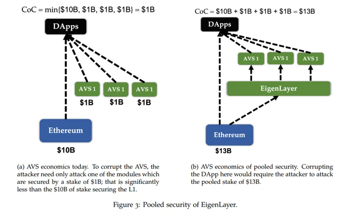 This native validation model can create a cold-start problem for new chains, potentially leaving them dead on arrival if they can’t amass a certain initial market cap (and the resulting economic security guarantee). With EigenLayer, new (and existing) L2s could suddenly gain the economic security of Ethereum itself for their transaction validation and security. This effectively de-couples the relationship between token price and the security of a network.