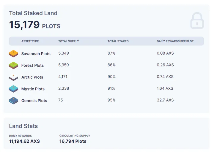 - Rewards are 11,194.62 AXS daily and differ based on the rarity-level of the staked land