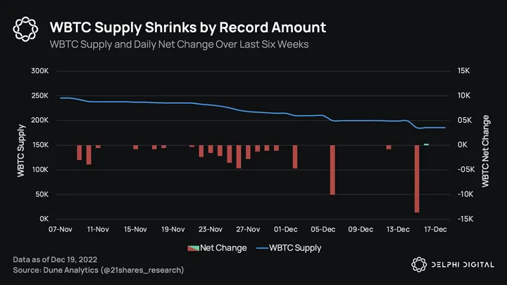 - The largest daily redemption of WBTC took place on Dec. 15, 2022, when 13.6K WBTC (worth $239M) were burned. In fact, three of the four largest daily redemptions ever occurred in December, all of which were carried out by market maker Wintermute.