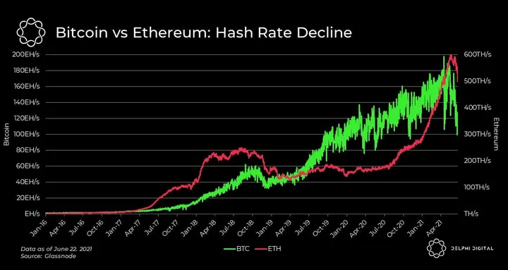 - On the bright side, Ethereum’s hash rate decline hasn’t been as severe as Bitcoin’s, falling just 16% versus Bitcoin’s 50% over the same time period.