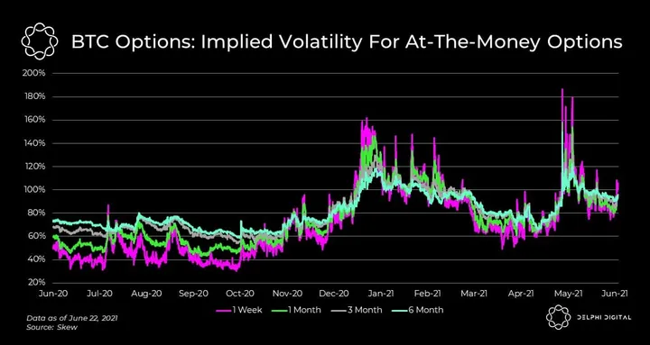 - As BTC price started to form a distribution range between April and May, IV started to rise as the options market started to price in potential downside.