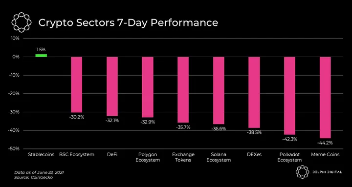 - The Polkadot ecosystem and meme coins were the hardest hit, but every major sector/ecosystem is down over 30% over the past week.