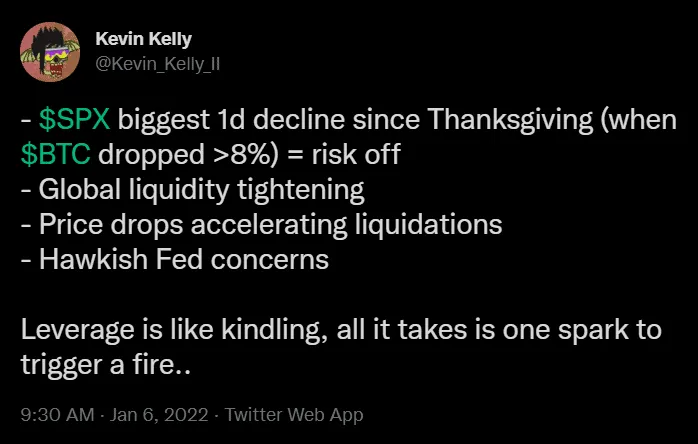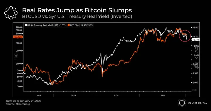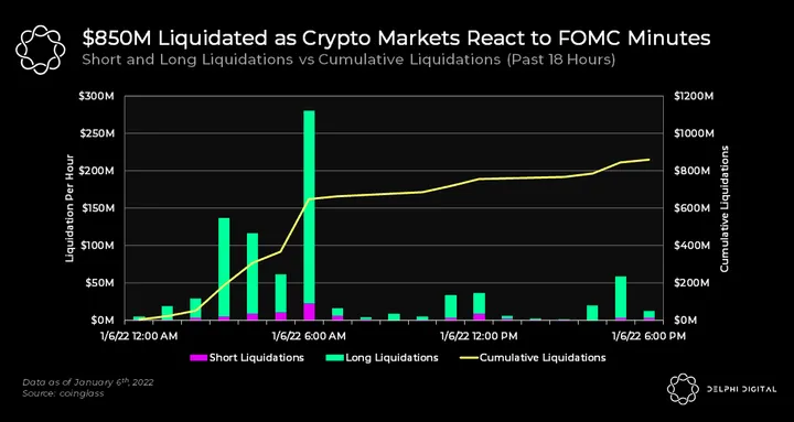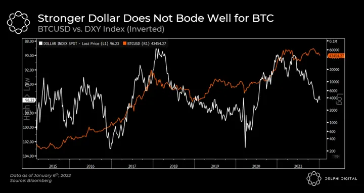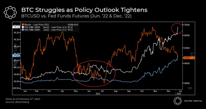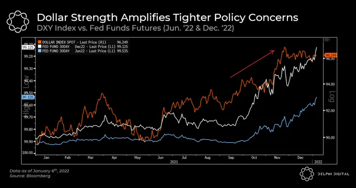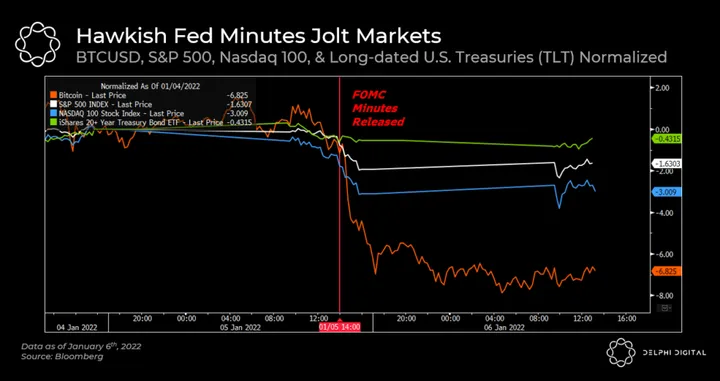 This week’s market sell-off is the latest example of this dynamic. The December FOMC minutes that were released on Wednesday turned out to be more hawkish than the market anticipated, which triggered a pullback in risk assets (BTC and crypto included).