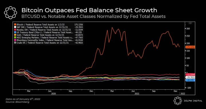 Taking a step back, an interesting chart I keep coming back to is BTC and major asset classes (stocks, bonds, commodities, etc.) normalized against the Fed’s balance sheet since the beginning of 2020. It helps highlight this concept that BTC is one of the most levered bets on currency debasement; keep in mind the Fed’s balance sheet more than doubled over the last two years, so asset prices at large are significantly higher today than they were then.