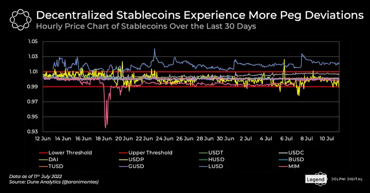 Despite USDT trading as low as 0.95 post-Terra fallout, centralized stablecoins have been more successful at holding their peg on a consistent basis. When USDT saw $7B of redemptions in 48H, the company successfully redeemed them at par, eventually giving arbitrageurs the confidence to step in and close the peg.