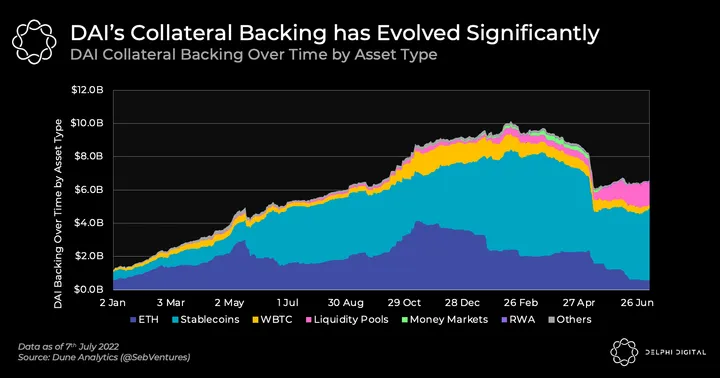 Initially, DAI was backed by a single collateral asset – ETH. Later, Multi Collateral DAI (MCD) was launched, allowing multiple types of crypto-collateral to be used to mint DAI. The backing of DAI has evolved dramatically over time as we see in the graph below. Maker is still making efforts to diversify its collateral base, going so far as to incorporate Real World Assets (RWA) as part of its collateral base. More recently, they’ve approved a $100M stablecoin vault for Huntingdon Valley Bank, which will use off-chain loans as collateral to mint DAI.