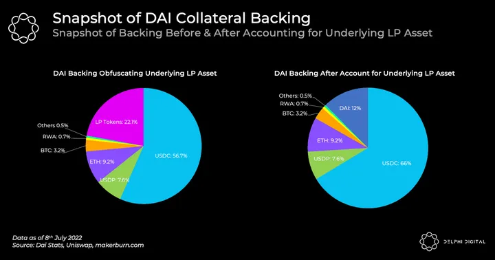 Taking external LP tokens used as collateral into account brings up 2 interesting corollaries. For the vast majority of LP tokens in Maker vaults, the underlying tokens that make up the LP token backing are essentially USDC and DAI. This means: 1) Maker is using more DAI to mint DAI and; 2) Maker’s USDC exposure is understated if one does not take the underlying LP assets into account.