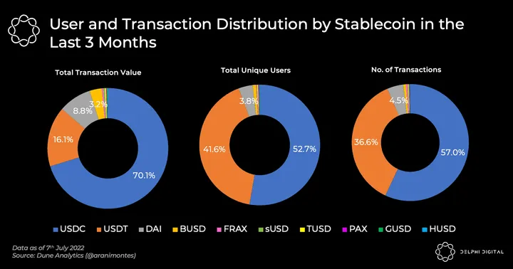 Unsurprisingly, USDT and USDC are still the preferred medium of exchange on Ethereum. This is followed by DAI, which shouldn’t come as much of a surprise. Between the first two, USDC comes out top in terms of total transaction value, unique users, and number of transactions. Average transaction size for USDC is almost 3 times higher than USDT, which indicates that it is more popular amongst “whales”. Again, this is likely attributable to their safer “collateral backing” which consists of US dollar cash or treasuries.