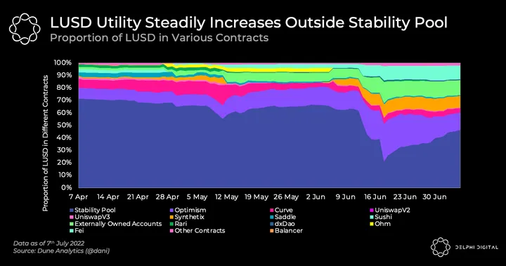 Near Liquity’s inception, there was concern regarding LUSD’s use case as almost all LUSD resided within the Stability Pool. Unsurprisingly, this resulted in illiquidity in DEXs and lending markets which made LUSD a decentralized stablecoin with low utility. However today, the Stability Pool makes up 46% of all LUSD deposits, down 73% from its April high.