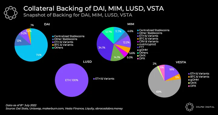 Currently, centralized stablecoins make up over 90% of stablecoin TVL; USDT, USDC, and BUSD consistently take the top three spots by market capitalization. We briefly explain the collateral backing and idiosyncrasies of notable coins below: