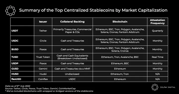 To wrap up centralized stablecoins, we summarize the characteristics of the largest centralized stablecoins by market capitalization below.