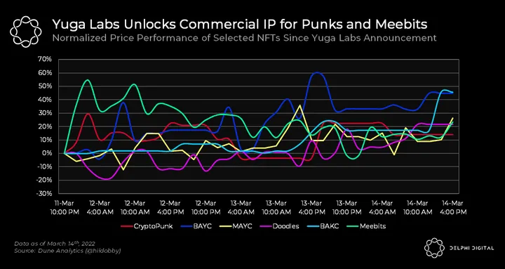 - Yuga Labs, the company behind Bored Ape Yacht Club (BAYC), announced they acquired the IP of the CryptoPunks and Meebits NFT collections. Their first line of business was to give full commercial rights to all their respective NFT holders. Prior to this, Larva Labs had full control over the intellectual property of CryptoPunks and Meebits and had restrictions on what the NFT holders could do. This acquisition could unlock the full potential of branding and commercialization of these NFTs that were previously limited.