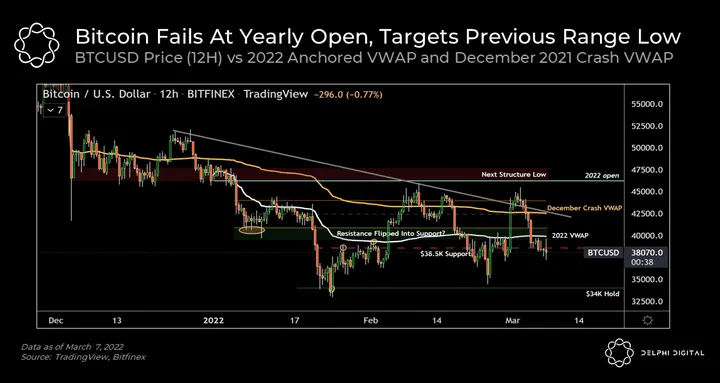 - Resistance at 2022 VWAP: Should price shake off the poor start to the week, and reverse course to the upside, the confluence of the 2022 VWAP level and the $40K psychological level will likely act as the first layer of resistance.