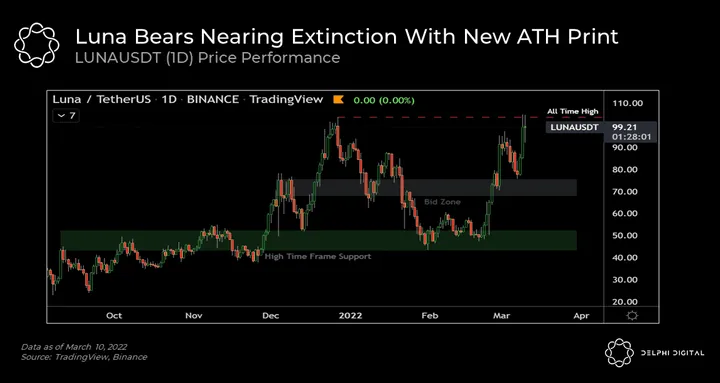 LUNA has been on an absolute rampage over the last two weeks, printing a fresh all-time high as markets continue their moves lower. At the time of this writing, LUNA is once again flirting with a triple-digit price tag after doubling from $50 to $100 in less than three weeks.