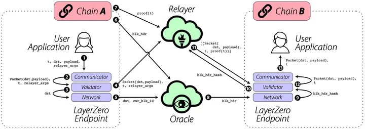 - Relayer: similar to the relayer but fetches proofs instead of block headers. While applications can become relayers themselves, it is handled by LayerZero in practice.