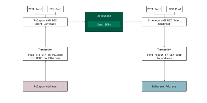 The best way to visualize ZETA’s role in message passing is with an example from the whitepaper, a cross-chain DEX. Under this example, a user wants to swap 1.2 ETH on Polygon for USDC on Ethereum. The path is as follows: