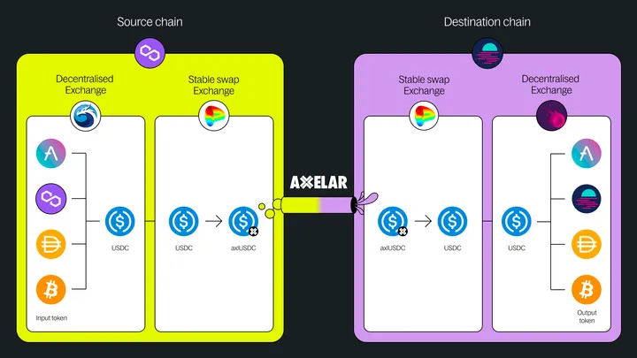 - Gas & Executor Services: The final step, Axelar deploys contracts called “Gas Receivers” on EVM chains which cover the destination chain’s gas fees and execute the cross-chain payload (send it to desired app). Users can pay in source-chain gas tokens and Axelar abstracts away the destination chain gas.