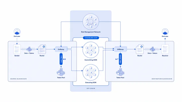 - Risk Management Network: A network of nodes that essentially double-check the Committing DONs Merkle root. They monitor the OnRamp contract and what the Committing DON posts to the commit store. CCIP will freeze if the RMN doesn’t bless (i.e. verify/confirm) the Merkle Roots.
