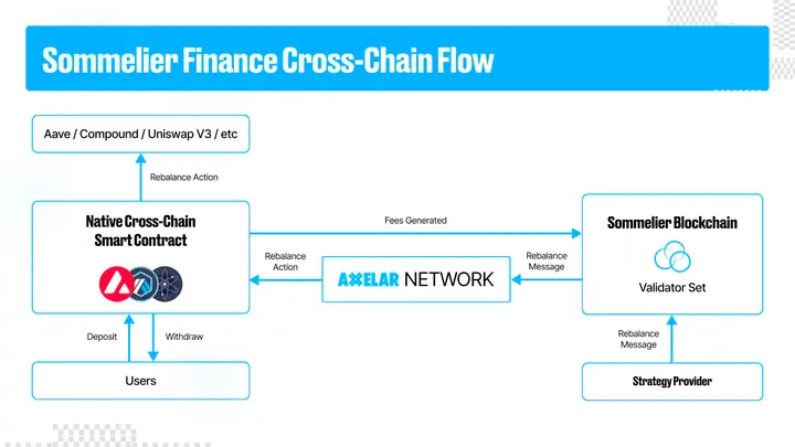 Axelar is a PoS chain with its own validator set (75 at the time of writing) and staking token, AXL. The components and message flow are as follows: