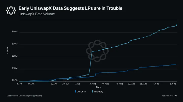 Some early data from UniswapX highlighted in our “Future of On-Chain Liquidity” report highlights this well. The first caveat we should add here is that these are orders that “didn’t” go through Uniswap AMMs first, and instead went to fillers for a better price. In other words, the % of total Uniswap volume that X takes up is low. However, it’s clear that when orders are routed to UniswapX that fillers prefer to use their own inventory to settle trades and take the settlement risk on themselves.