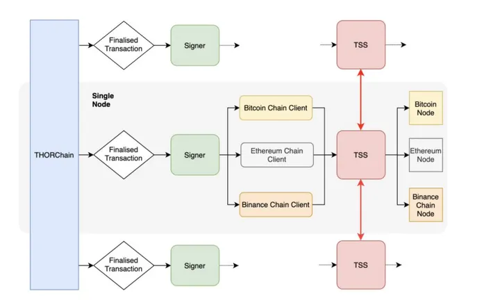 At the end of execution, an outgoing tx is generated and assigned to an external vault. This outgoing tx is once again, transformed from a standard THORChain format into its chain-specific format via the respective chain client. THORNodes managing the assigned external vault then sign on this tx via TSS at which point the tx can be mined/finalized on the external chain. Once again the outgoing tx may be anything related to one of the 3 products: a swap, a withdrawal etc.