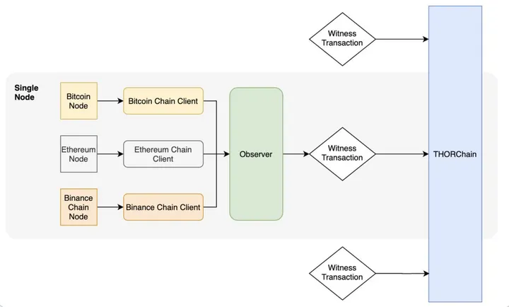 Under Bifröst, each THORNode runs full nodes of external chains that THORChain supports. This allows each one of them to independently observe “incoming txs” concerning a THORChain vault; an external address collectively owned and managed by THORNodes.