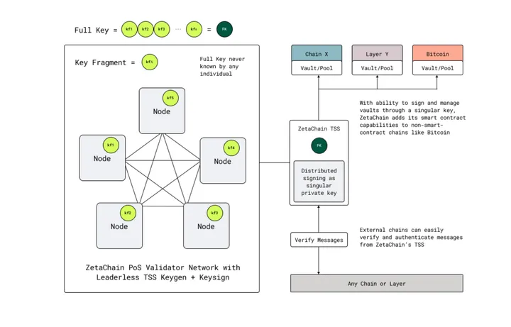 - Signers: ECDSA/EdDSA keys are shared between nodes such that only a supermajority (2/3) can sign transactions on external chains. The signers are how Zeta custodies assets and signs messages on external chains. On smart contract platforms like Ethereum these can be used to interact with smart contracts and custody assets and to custody assets on non-smart contract chains like Bitcoin and Dogecoin. A chart of signing from the whitepaper is below.