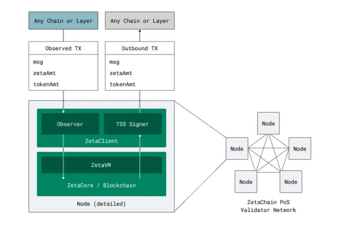 Below is the high-level architecture, with nodes running both the ZetaCore and ZetaClient software. ZetaCore is the client for producing blocks and running the L1, similar to any other PoS blockchains. ZetaClient is responsible for the cross-chain actions such as observing and signing events. Zeta’s nodes perform three key functions: validation, observation & threshold signing. They’re three distinct roles but are all run by each node operator.
