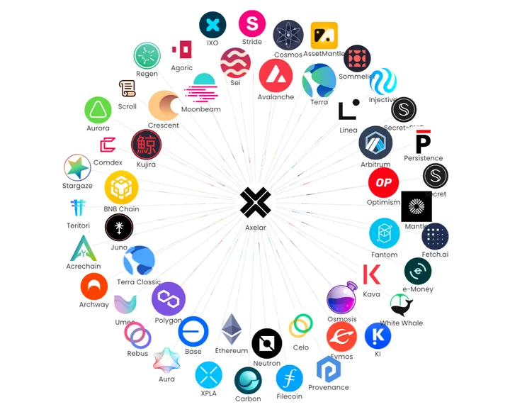 Axelar is predominately a way to connect Ethereum and Cosmos based chains. Below is the map of connected chains.