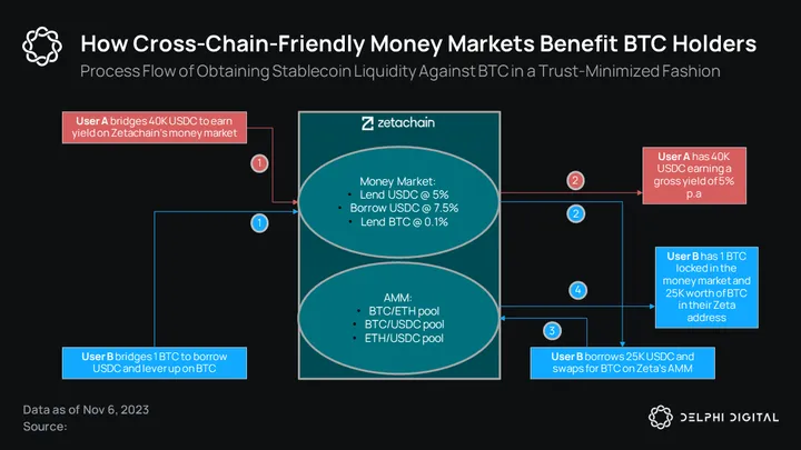Hardline Bitcoiners probably wouldn’t use any lending products anyway. But an omnichain money market built on Zetachain would provide the opportunity to do so for larger holders who would prefer to make their BTC productive without the liquidity woes of Sovryn, minimal subsequent functionality of the loan with THORChain, and counterparty risk/centralization of WBTC or CEXs.