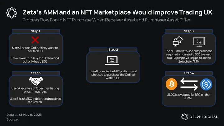 Assuming both buyers and sellers of Ordinals are flexible to receive/pay whatever asset they want, the swapping process is only required when the asset used to purchase the Ordinal and the asset the seller wants differ. Zetachain’s native liquidity pools can also help facilitate this.