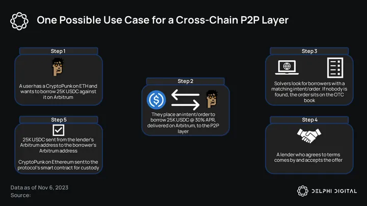 A mechanism like this would work for a variety of use cases and instruments. For someone who has a CryptoPunk on Ethereum and wants a loan to yield farm on Arbitrum, things can get messy. You have to hop on to P2P NFT lending platform, find a counterparty willing to lend to you, and then bridge those funds to Arbitrum. What if you could instead send your intent to use your Punk as collateral on Ethereum to receive a loan (at specified terms) on Arbitrum?
