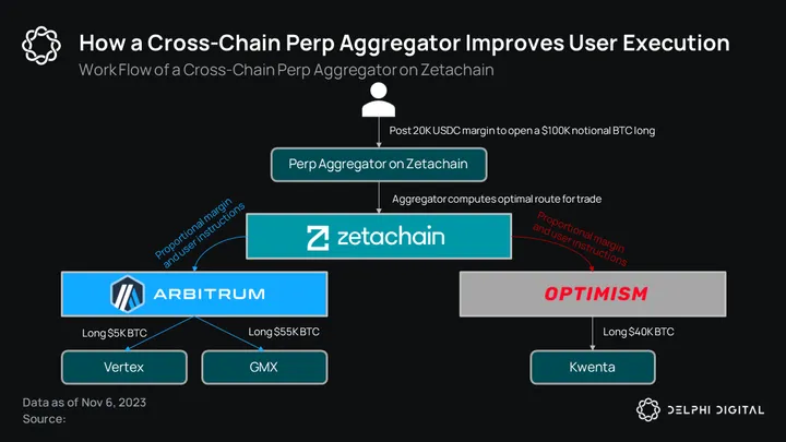 A trader who wants to long $100k notional of BTC could theoretically have this order split across several venues on different chains. If the app’s algorithm determines that the best execution for a market order is to split up the position by holding 55% on GMX, 40% on Kwenta (Synthetix), and 5% on Vertex Protocol, the user is able to access optimized execution across venues. An app like this is theoretically possible with Zetachain’s architecture.
