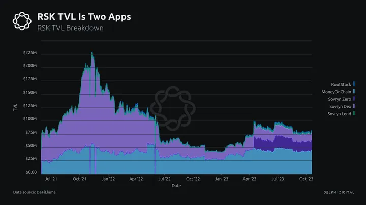 RSK is a fork of GETH, and it’s compatible with the EVM as it has its RSKVM. As RSK is EVM compatible, ETH wallets like Metamask work with it, although the UX of transferring BTC over is relatively clunky. 98% of RSK’s TVL is in two apps: Money On Chain and Sovryn.