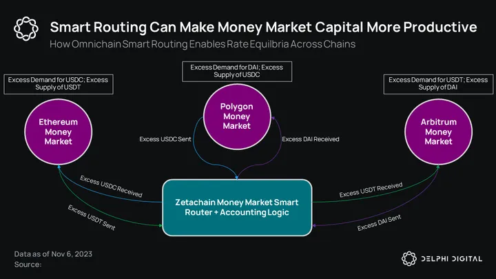 Think about an app that takes in USDC deposits on Zeta and deploys them across Aave (Ethereum, Polygon, Arbitrum, Optimism), Venus (BSC), Compound (Ethereum), and Radiant (BSC, Arbitrum). The smart contract suite, across chains, can communicate with each other to ensure optimal capital allocation for yield. So, from a UX standpoint, you would just need to deposit your asset of choice into a Zetachain smart contract — and the rest is on autopilot.