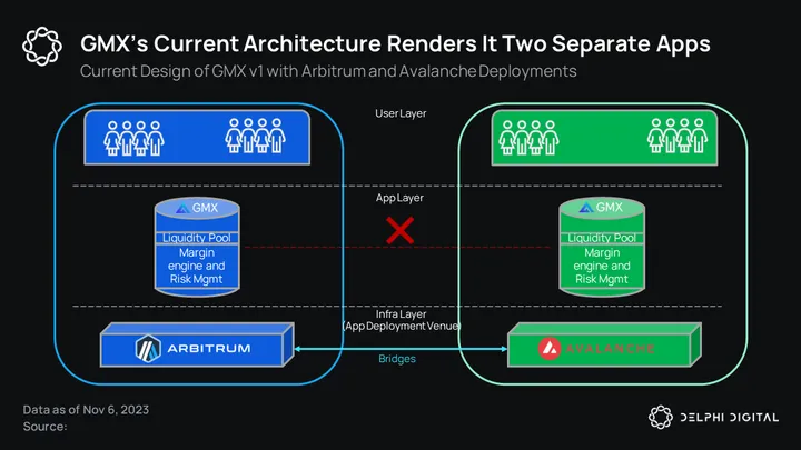 Essentially, GMX today is like two separate apps where the blockchains they are deployed on — Arbitrum and Avalanche — can bridge assets between one another, but the GMX contracts on each chain cannot communicate with each other.