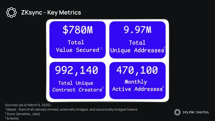 RWA Dominance: ZKsync Era is the second-largest blockchain for tokenized Real World Assets (RWAs), holding 27% market share, only behind Ethereum.