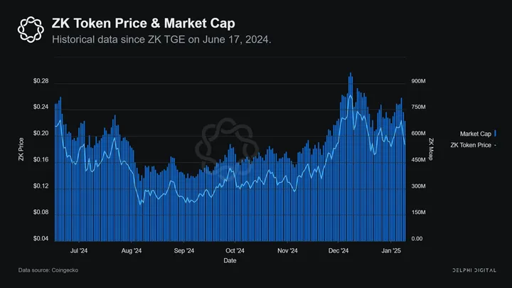 As of January 9, 2024, the ZK token trades at a price of $0.187 with a circulating market cap of ~$687.2M. While the circulating supply is 3,675,000,000, the total supply of ZK tokens is 21,000,000,000 resulting in a fully diluted valuation of $3.927B at the current ZK price.