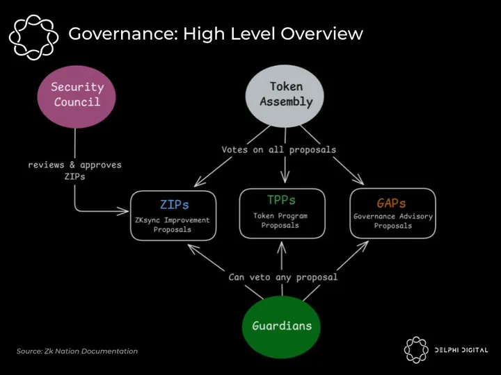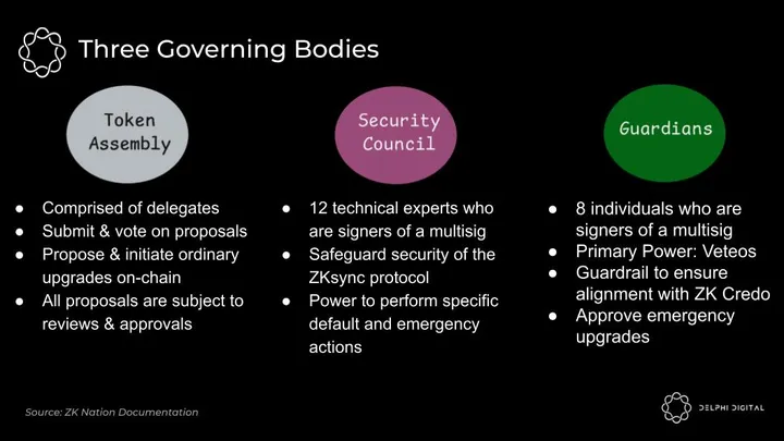 To prevent a rogue or adversarial government body abusing its power, the ZK governance system consists of 3 governing entities implementing separation of powers, checks, and balances: the Token Assembly, the Security Council, and the ZK Guardians.