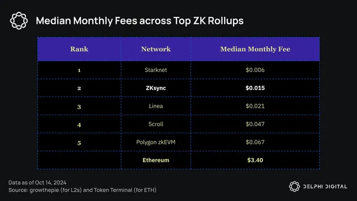 To turn a profit, the zkEVM covers these costs and generates revenue by charging users a transaction fee for L2 transactions. ZKsyncs’ transaction fees are substantially lower than Ethereum’s fees and the median monthly fee is the second lowest compared to other top ZK rollups.